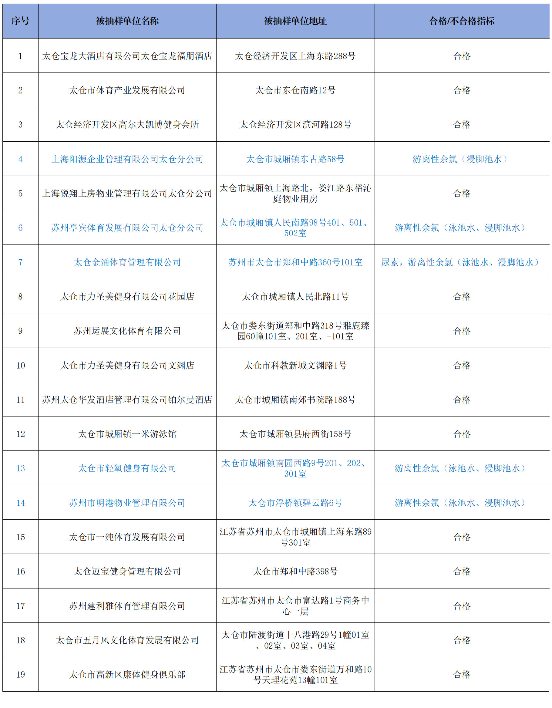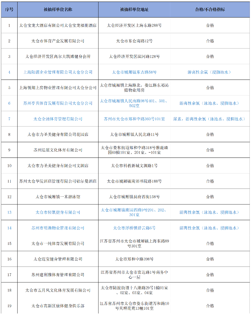 7月22日至23日,市卫健委委托第三方检测机构,对全市正在营业的游泳场所进行了池水水质监督抽检,检测游离性余氯、PH值、浑浊度、尿素、菌落总数、大肠菌群等项目。