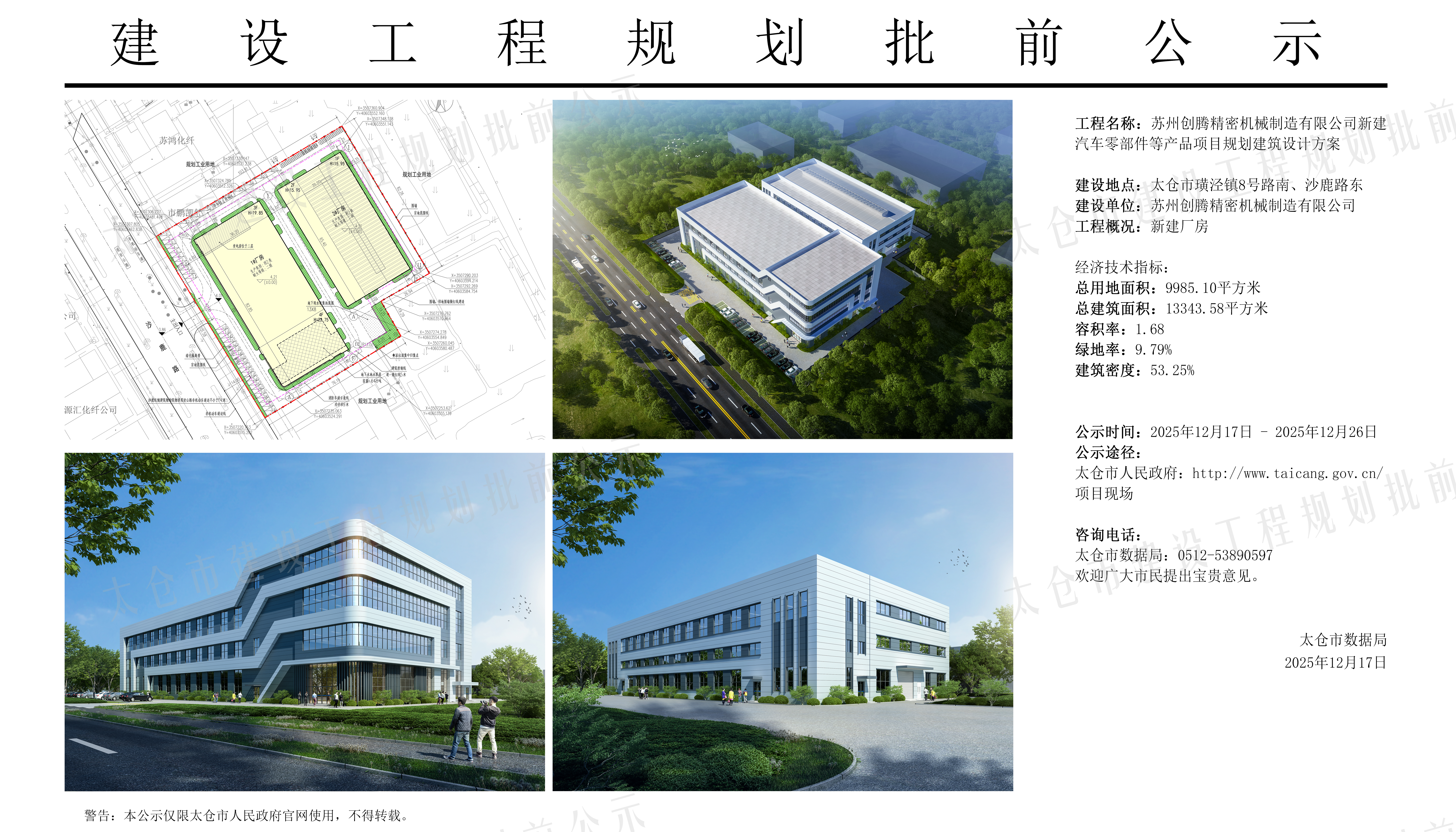 建设工程规划批前公示(苏州创腾精密机械制造有限公司新建汽车零部件等产品项目规划建筑设计方案)