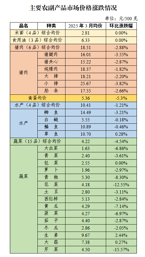 三月,太仓主副食品价格整体回落。具体情况如下: