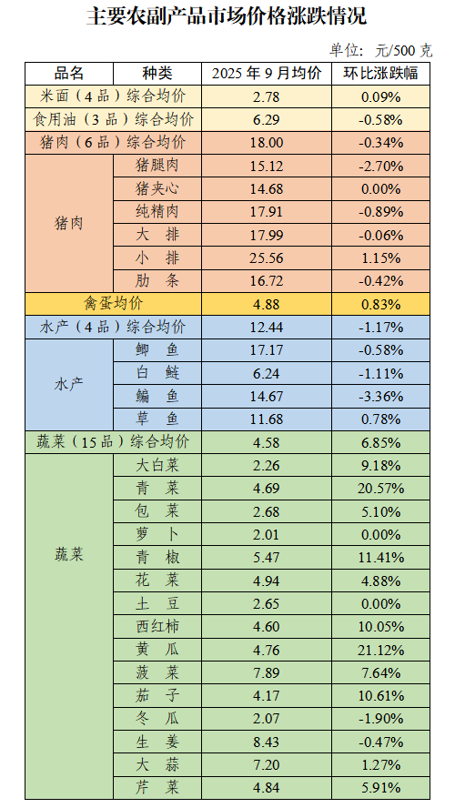 粮油价格基本稳定。米面每500克综合均价2.78元,环比上涨0.09%;食用油每500克综合均价6.29元,环比下降0.58%。