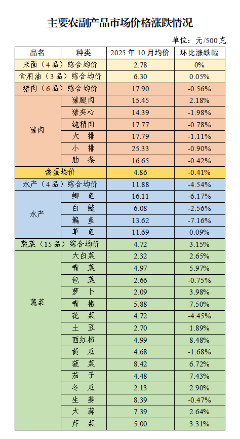 粮油价格基本稳定。米面每500克综合均价2.78元,与上月持平;食用油每500克综合均价6.3元,环比上涨0.05%。