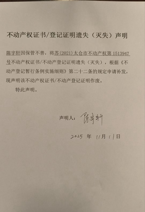 不动产权证书/登记证明的遗失(灭失)声明