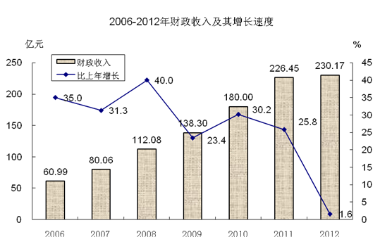 全年完成财政收入230.17亿元,比上年增长1.6%;其中公共财政预算收入90.15亿元,增长5.6%。公共财政预算支出86.16亿元,增长7.0%。