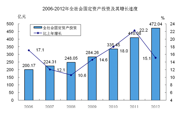 全年完成全社会固定资产投资472.04亿元,比上年增长15.1%。其中,工业投资236.96亿元,增长11.4%;服务业投资235.08亿元,增长19.3%;高新技术产业投资46.38亿元,新兴产业投资128.74亿元,占全社会固定投资的比重分别为9.8%和27.3%。分地区看,城镇投资330.87亿元,增长12.0%;农村投资141.17亿元,增长23.0%。