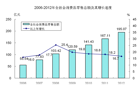 全年实现社会消费品零售总额195.07亿元,比上年增长16.7%。按消费形态统计,批发和零售业零售额168.89亿元,增长16.9%;住宿和餐饮业零售额26.18亿元,增长15.6%。按经营地统计,城镇消费品零售额128.97亿元,乡村消费品零售额66.10亿元,分别增长17.6%和14.9%。