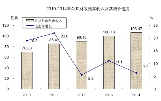 全年实现公共财政预算收入106.47亿元,比上年增长6.3%;其中,税收收入90.97亿元,增长10.8%,占公共财政预算收入比重达85.4%,比上年提高3.4个百分点。全年公共财政预算支出97.63亿元,比上年增长5.7%。