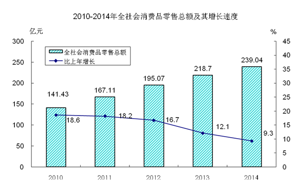 全年实现社会消费品零售总额239.04亿元,比上年增长9.3%。按消费形态统计,批发和零售业零售额204.34亿元,增长10.1%;住宿和餐饮业零售额34.70亿元,增长5.1%。按经营地统计,城镇消费品零售额155.03亿元,乡村消费品零售额84.01亿元,分别增长2.3%和25.0%。