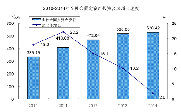全年完成全社会固定资产投资530.42亿元,比上年增长2.0%。其中,工业投资287.99亿元,增长11.2%;服务业投资242.38亿元,下降7.1%。高新技术产业投资35.38亿元,新兴产业投资134.07亿元,占工业投资的比重分别为12.3%和46.6%。