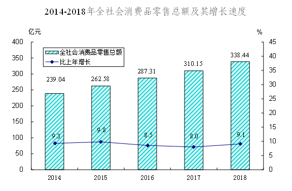 全年实现社会消费品零售总额338.44亿元,比上年增长9.1%。按消费形态统计,批发和零售业零售额290.51亿元,增长9%;住宿和餐饮业零售额47.93亿元,增长9.6%。按经营地统计,城镇消费品零售额219.43亿元,乡村消费品零售额119.01亿元,分别增长9%和9.3%。