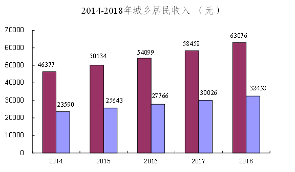 全年城镇居民人均可支配收入63076元,农村居民人均可支配收入32458元,分别增长7.9%和8.1%。城镇居民人均生活消费支出37187元,农村居民人均生活消费支出22216元,分别增长5.2%和6.2%。城乡居民食品支出占生活费支出的比重(恩格尔系数*)分别为29.2%和30.3%。