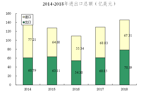 全年实现进出口总额145.70亿美元,比上年增长12.3%,其中出口总额67.31亿美元,增长10.6%;进口总额78.39亿美元,增长13.9%。