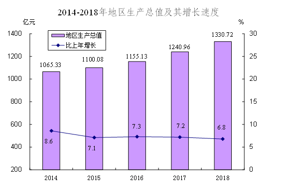 2018年,全市实现地区生产总值1330.72亿元,按可比价格计算,比上年增长6.8%。其中,第一产业增加值34.98亿元,下降3.6%;第二产业增加值675.47亿元,增长6.4%;第三产业增加值620.27亿元,增长7.7%。按常住人口计算,人均地区生产总值18.55万元。第一产业增加值占地区生产总值的比重为2.6%,第二产业增加值比重为50.8%,第三产业增加值比重为46.6%。