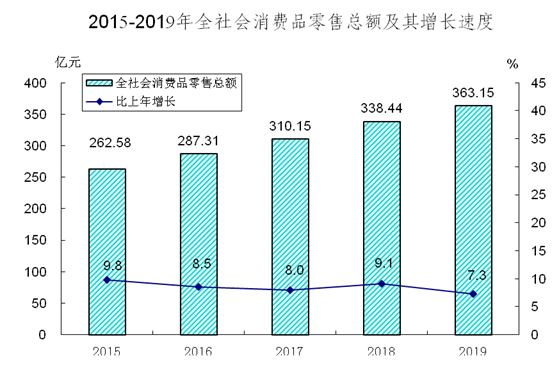 全年实现社会消费品零售总额363.15亿元,比上年增长7.3%。按消费形态统计,批发和零售业零售额312.24亿元,增长7.5%;住宿和餐饮业零售额50.91亿元,增长6.2%。按经营地统计,城镇消费品零售额235.57亿元,乡村消费品零售额127.58亿元,分别增长7.4%和7.2%。