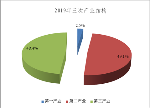 2019年,全市实现地区生产总值1324.97亿元,按可比价格计算,比上年增长5.4%。其中,第一产业增加值32.59亿元,下降4.0%;第二产业增加值651.10亿元,增长5.1%;第三产业增加值641.29亿元,增长6.3%。按常住人口计算,人均地区生产总值18.40万元。第一产业增加值占地区生产总值的比重为2.5%,第二产业增加值比重为49.1%,第三产业增加值比重为48.4%。