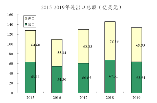 全年实现进出口总额133.57亿美元,比上年下降8.3%,其中出口总额63.64亿美元,下降5.5%;进口总额69.93亿美元,下降10.8%。