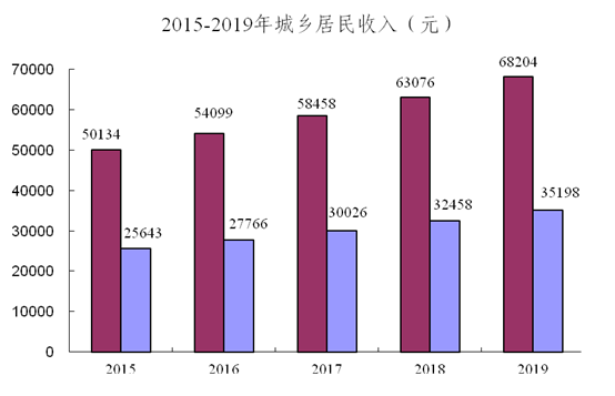 全年城镇居民人均可支配收入68204元,农村居民人均可支配收入35198元,分别增长8.1%和8.4%。城镇居民人均生活消费支出39187元,农村居民人均生活消费支出23762元,分别增长5.4%和7.0%。城乡居民食品支出占生活费支出的比重(恩格尔系数*)分别为28.9%和29.0%。