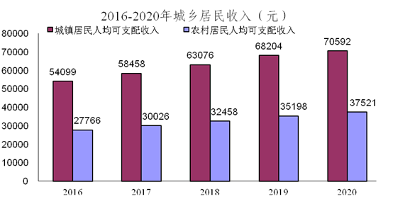 全年城镇居民人均可支配收入70592元,农村居民人均可支配收入37521元,分别增长3.5%和6.6%。城镇居民人均生活消费支出38584元,农村居民人均生活消费支出22912元,分别下降1.5%和3.6%。城乡居民食品支出占生活费支出的比重(恩格尔系数*)分别为27.9%和28.0%。