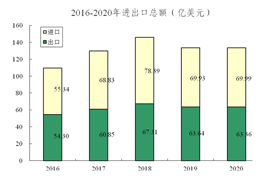 全年实现进出口总额133.35亿美元,比上年下降0.2%,其中出口总额63.36亿美元,下降0.4%;进口总额69.99亿美元,增长0.1%。