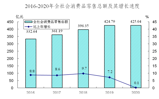 全年实现社会消费品零售总额425.04亿元,比上年增长0.1%。按消费形态统计,批发和零售业零售额395.29亿元,增长1.7%;住宿和餐饮业零售额29.75亿元,下降17.6%。按经营地统计,城镇消费品零售额384.66亿元,同比增长0.1%,乡村消费品零售额40.38亿元,与上年持平。