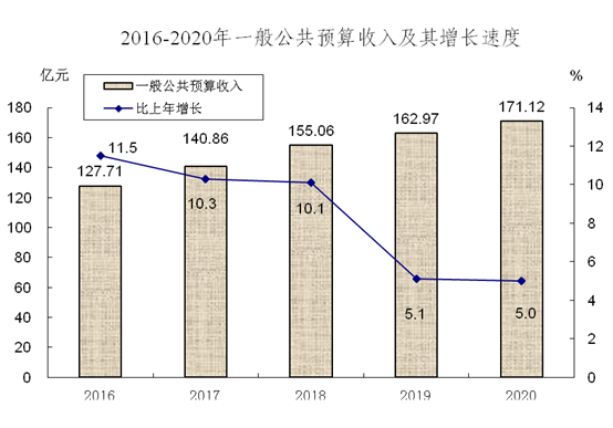 2020年,太仓市共实现一般公共预算收入171.12亿元,比上年增长5.0%;其中税收收入147.21亿元,增长4.8%;税收占比为86.0%。全年一般公共预算支出151.06亿元,比上年增长5.5%。