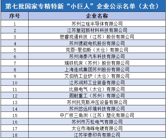 10月20日,根据工信部统一部署,江苏省工业和信息化厅对拟认定的第七批国家专精特新“小巨人”企业名单进行公示。我市共有18家企业入围,获评数量创历史新高!